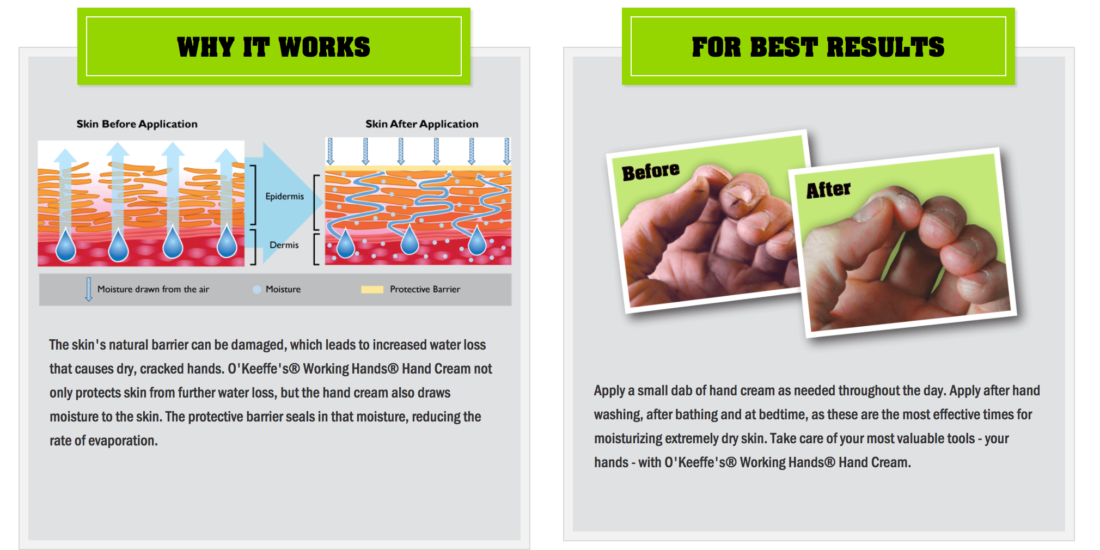 The color combination of the packaging reminded me of Nickelodeon slime, the same I used as a kid to prank my sister. Make no mistake: there was no fluff in the packaging, nothing chic about the fonts. It simply said it would do the job, healing hands that had a “crack & split.” I quickly did a Google search on my phone to see what O’Keeffe’s, this $7 cream, was about. Review after review, there were people who said that it was the only cream that helped them out. Others wrote how it was an instant miracle, their hands healing almost overnight. The brand is so confident it works, it also touts a 100% Money Back Guarantee on its website.