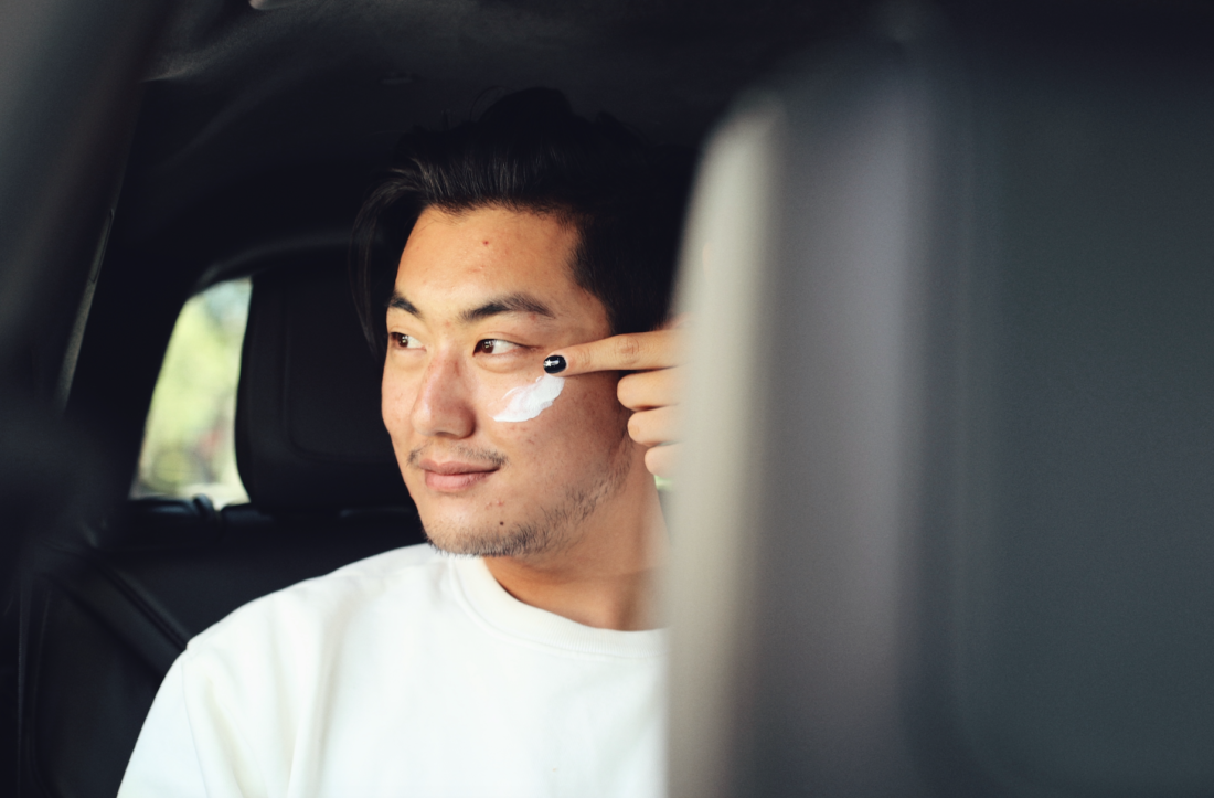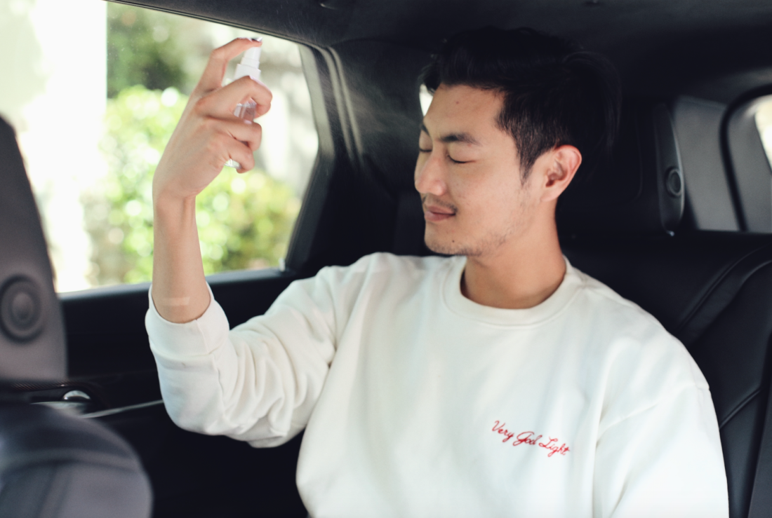 Afterwards, I mist my face with a toner. The one that I used is from Huxley. I spray two times, press into my skin, then repeat three times over. This softens my skin, allows it to balance out its pH, and gets it prepared to soak any products. My driver comments that it smells like cactus. I tell him it’s made from prickly pear cactus. He asks if I can spritz him, too. I comply.