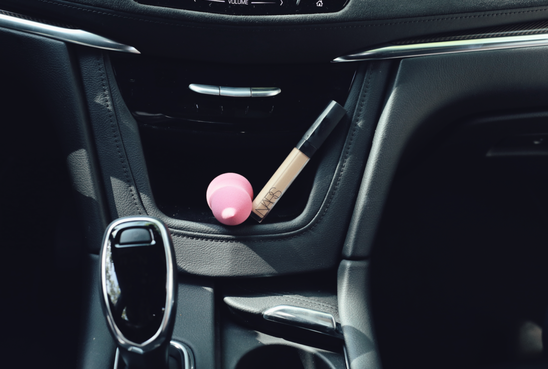 After my skin is in a good place, I ask my driver or friend to hand me my NARS concealer and beauty blender that somehow made it to the front seat. NARS’ concealer is actually perfect for my bag since it’s slender, takes up virtually no real estate and is truly handy for such occasions.