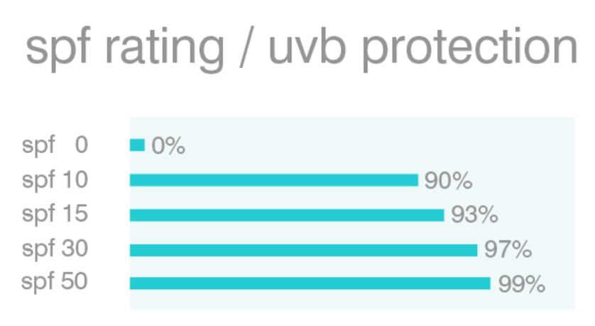 Good rule of thumb: the higher the number, the greater coverage. But know that unfortunately, nothing will provide you with 100% of coverage. Here’s a really good graph from the good folks at Coola.