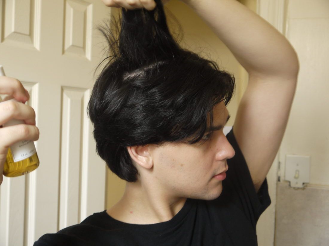 “When my hair is still a little wet I’ll spray the Bumble and Bumble Tonic Lotion Primer. It has tea tree, peppermint, rosemary, and hopps. I spray it on my scalp and its super soothing on my scalp and also it’s a primer and de-tangler. I tend to lift my hair up and spray under it, I’ve got really thick hair so if I spray from above it will really weigh everything down, so I have to go from underneath. The Oaui Wave Spray is amazing. I love the smell, it gives me some texture without heaviness, and I hold it really far away, and do a really light spray, sort of shake the hair and let it fall.”