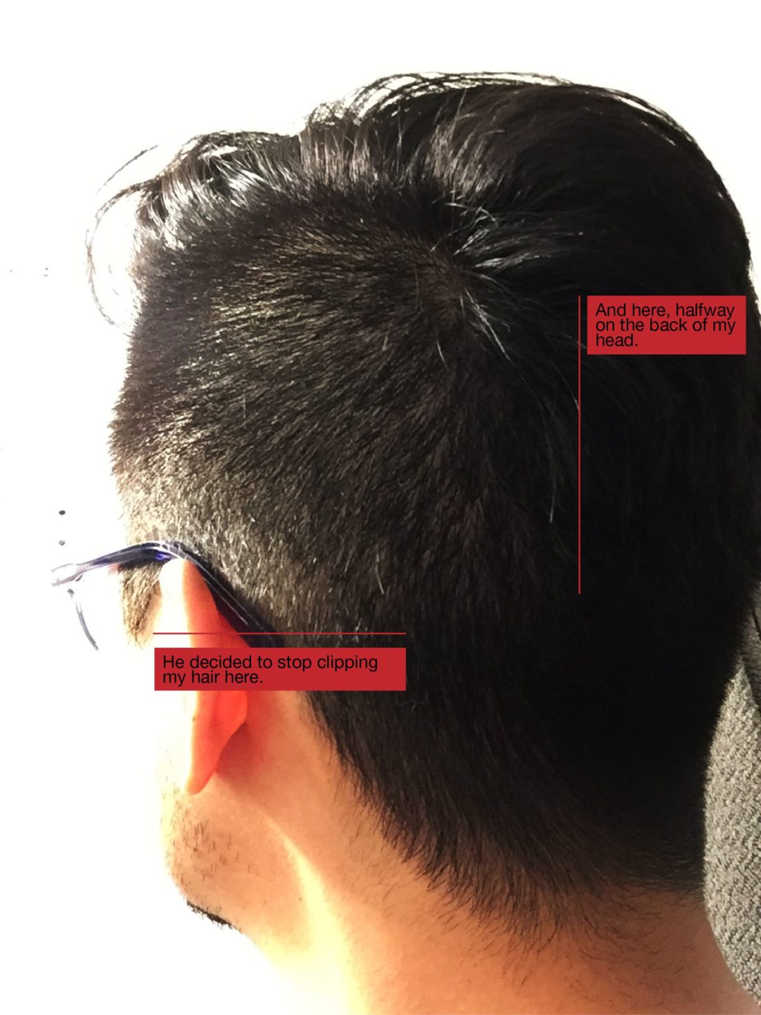 Sure, there were times when things were a little shorter than I wanted, or I had to make a few adjustment with my clippers at home. But I’d never been in a situation where there was an entire missing chunk of hair that was shaved off.