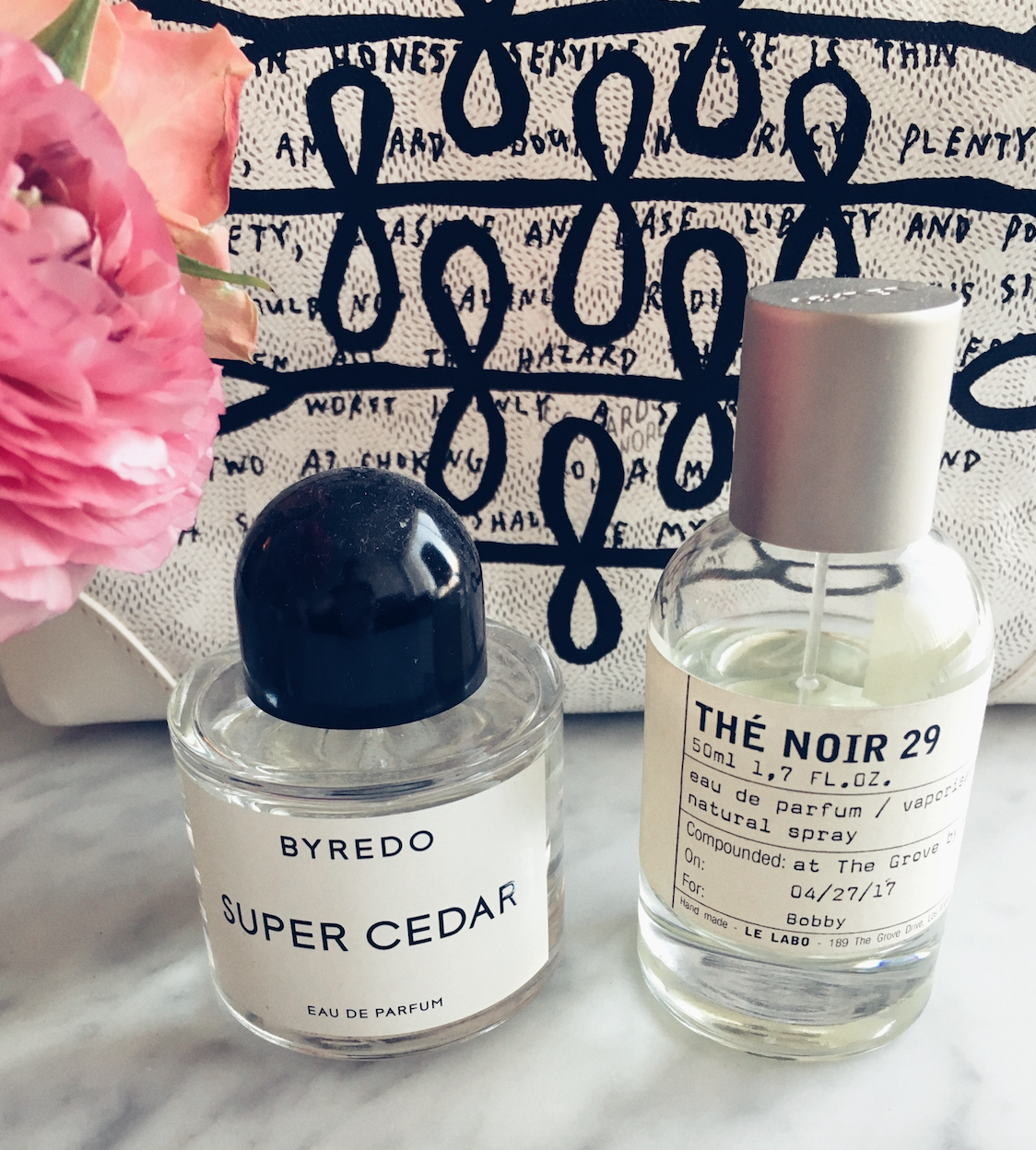 on my wrists, neck, and hair. I love any scent that has cedar notes—it makes me feel modern, sexy, and warm. Byredo’s Super Cedar is one of my absolute favorites. I also just recently started using Le Labo’s The Noir. Again, I like the depth of the cedarwood and musk.