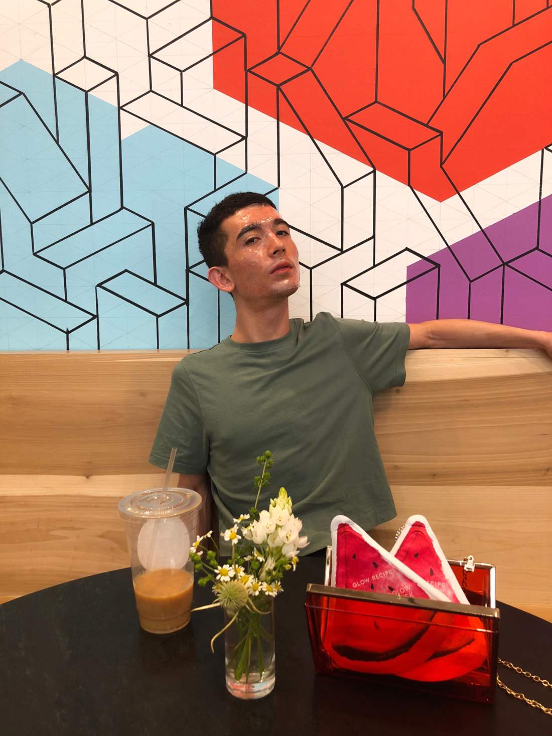 I started my #maskanywhere journey at a Greek yogurt-focused café in SoHo. It’s a weekend so tourists and locals were coming in and out of the space. Busy enough where I wouldn’t go unnoticed. Perfect. After grabbing a large iced coffee, I took a seat near the back and started opening up the mask. The triangular packaging is insanely cute, shaped like a watermelon slice that I wished was in my hand. Upon opening, a sweet watermelon Jolly Rancher fragrance wafted up to my nose. It wasn’t cloyingly sweet, though. This is the real stuff. The first two ingredients of the mask are watermelon fruit extract and watermelon fruit. A juice, but for your face.