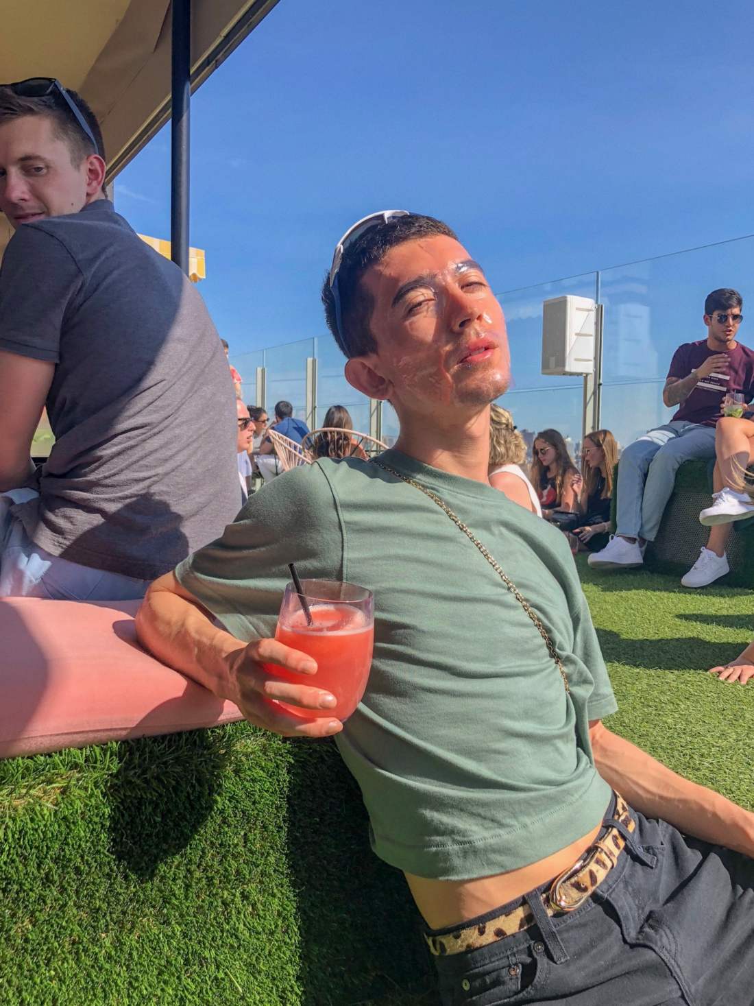 Ok, the last and final destination: a rooftop bar. The crème de la crème of New York City summer hangout spots. I made my way to the roof of the Standard Hotel where there’s already a crowd at 4 pm. I ordered a frozen slushie at the bar and found a spot near the glass wall to hang out. With zero hesitation, I slip on my last mask. I’m a public masking veteran at this point. Some people are staring, but most of them are busy in conversation. That was until a couple girls walked in and saw me glistening. And definitely sweating.