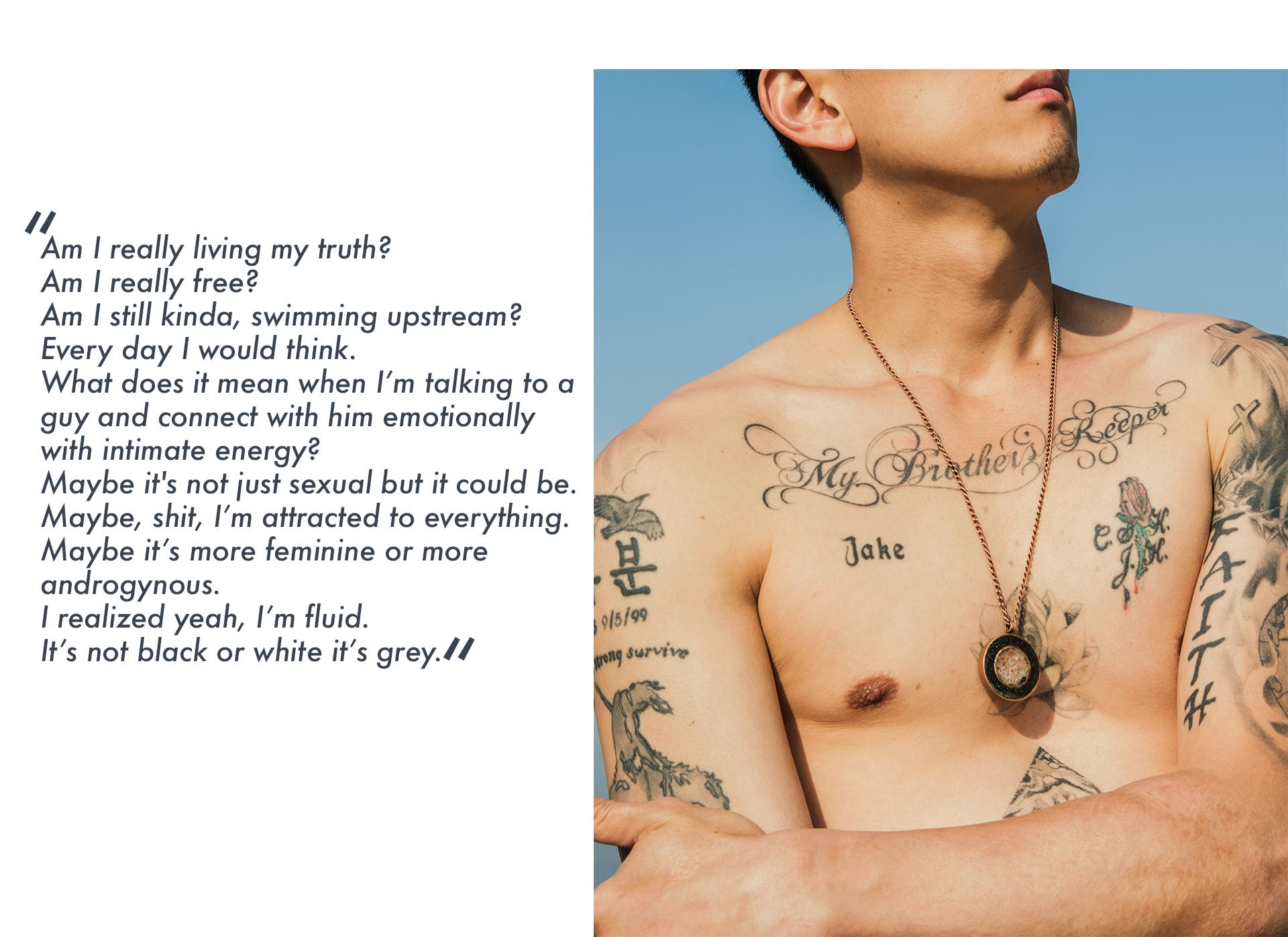 “Ever since I was young, all the images you saw around you, or at least for me, was catered towards heterosexuals,” he says. “Very cis, very heterosexual. I was an athlete. When you’re an athlete everything is hypermasculine and hetero. That’s where you think you’re supposed to be and everything else is abnormal and you’re not supposed to do that.”
