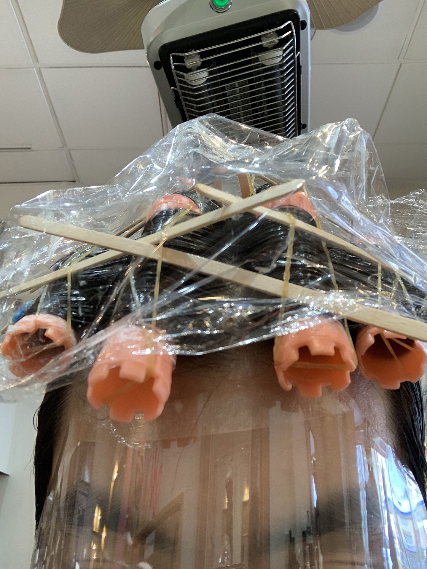 The top wave perm is a little more complicated. The stylist put an intense chemical concoction and soaked my hair strands. This allows the pores to be open for change. Then, he put curlers into my hair – about 20 in total – and wrapped saran wrap over my hair. This allows the moisture to seep deeply into each strand and permanently keep its curly form. After putting curlers in, I went under a heater for 25 minutes so my hair could keep its new form. The stylists then add wooden sticks so that the curls grow out in a specific way, which I thought was truly weird, but actually very smart. It’s like what they use for plants, I mused.