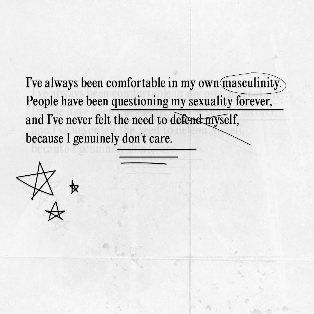 “I’ve always been comfortable in my own masculinity,” he says. “People have been questioning my sexuality forever, and I’ve never felt the need to defend myself because I genuinely don’t care.” His supportive family allowed him to explore his identity, a gift that he remains very grateful for.