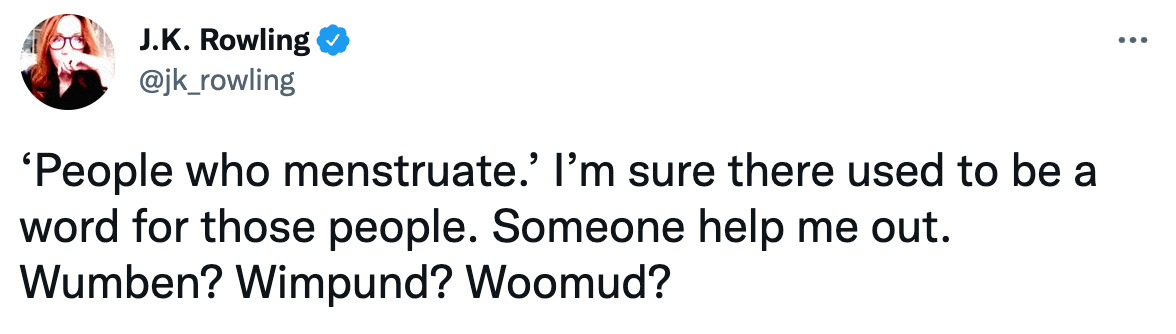 If you reflect on 2020, you might recall an instance where a certain author, henceforth known to me as She Who Shall Not Be Named — criticized an article for using the phrase, “people who menstruate.”