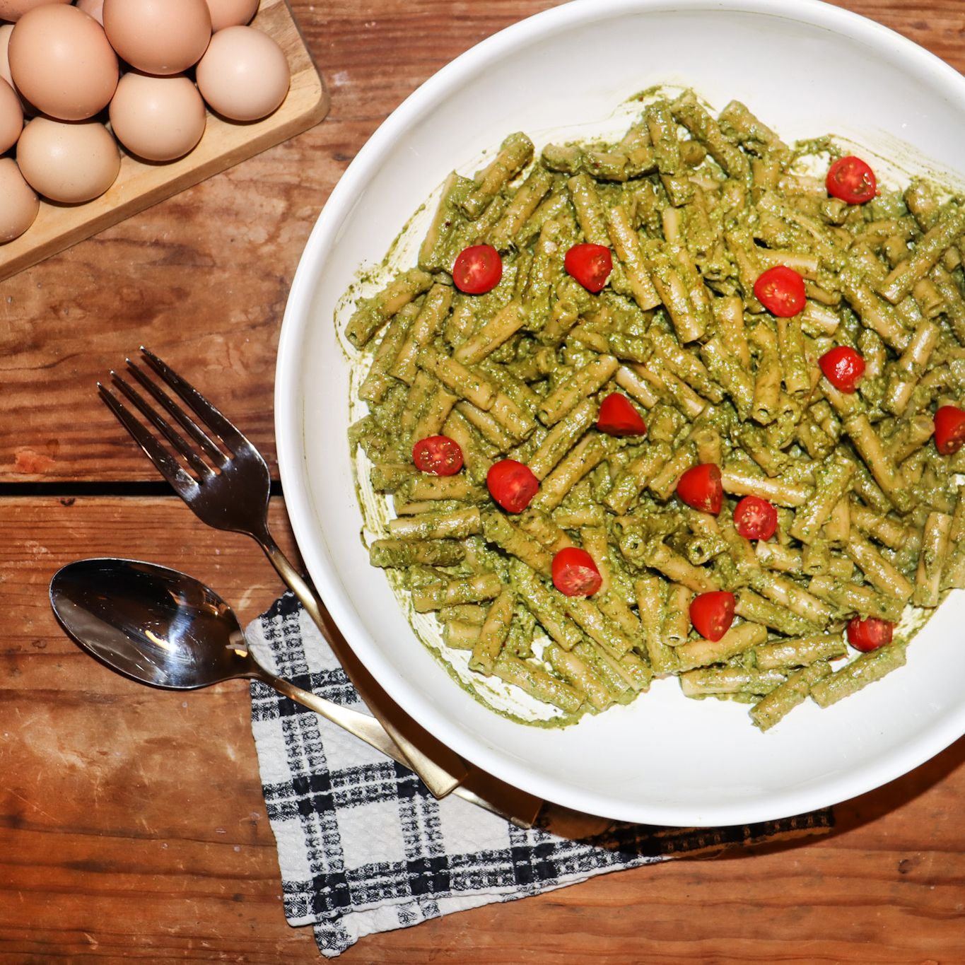 My husband comes out to see what’s for dinner once it starts to get dark and I’ll head inside and get cooking. I've been making vegan pesto quite a bit lately — it’s so quick, easy, and delicious. If I don’t feel like cooking, I’ll send him off to pick something up like a pizza from Woodhouse Pizza or veggie sushi. Then we snuggle up on the sofa with our dog, Levi, and continue binging whatever show we’re currently into (right now, Abbott Elementary is doing the trick) while we enjoy our dinner.