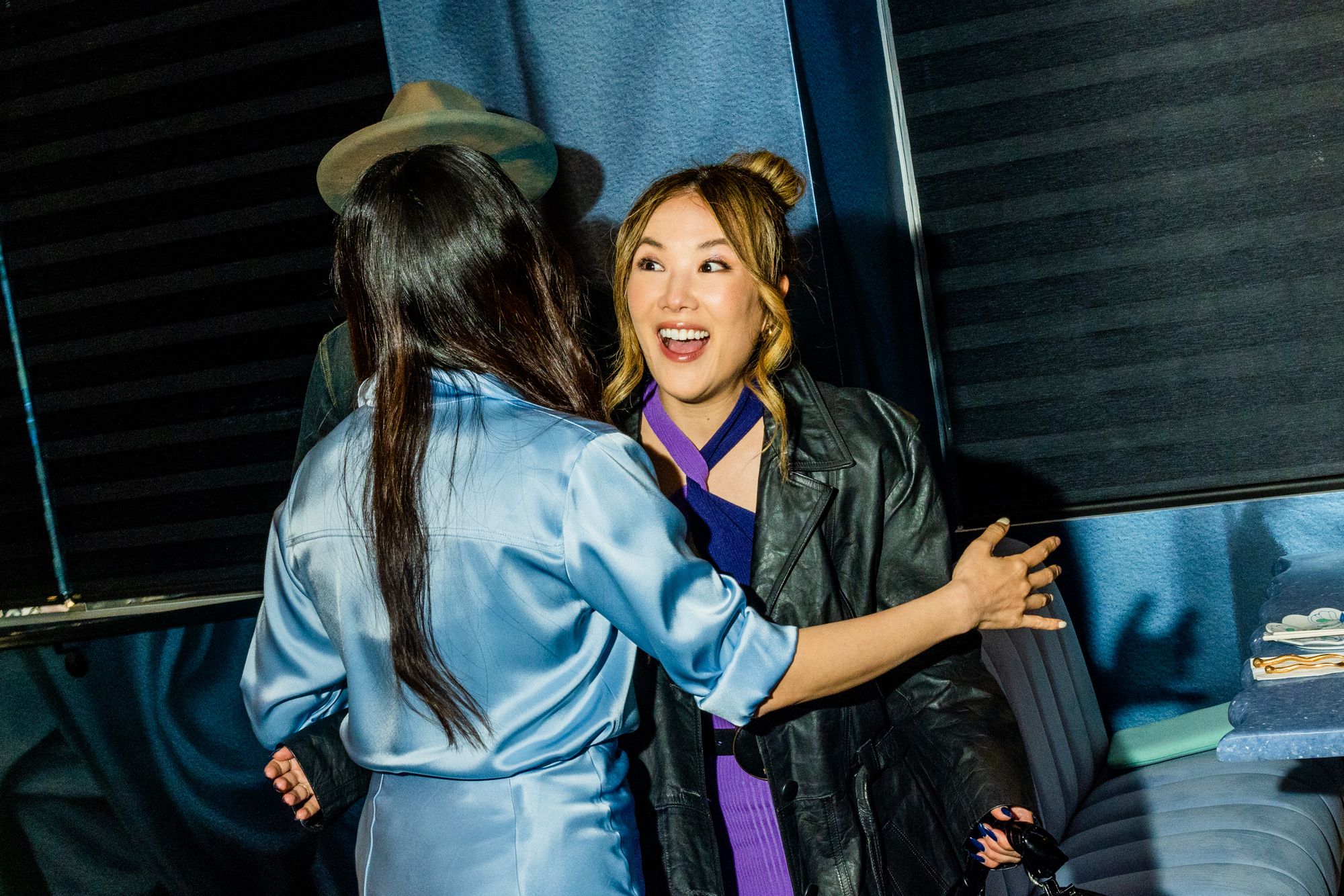 She went to greet others in the same color scheme, embracing the actress Ally Maki, Christine Ko, and good light cosmetics founder, David Yi.